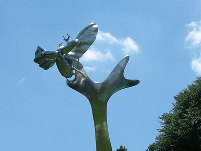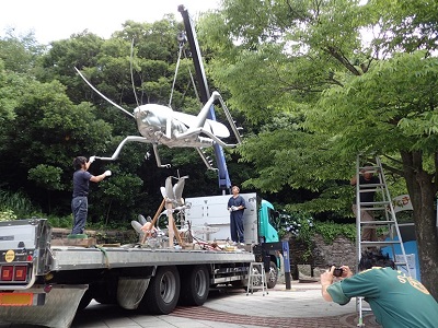 この光り輝く巨大昆虫オブジェは、ステンレス彫刻家 中嶋大道さんの作品たちです。