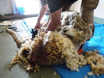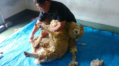 (毛刈り本番に向けての下処理中。本番はお客さまの前で行いました。)