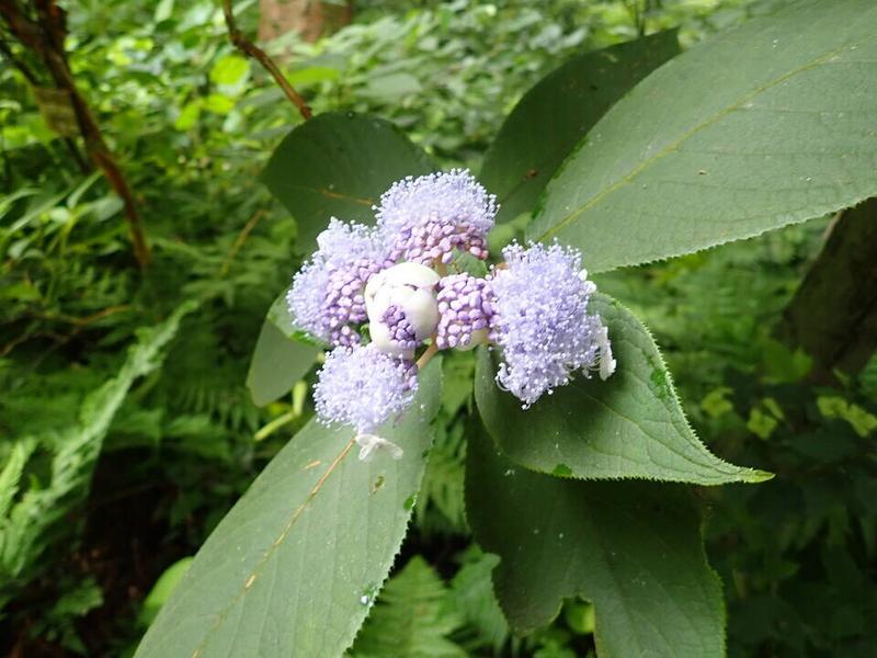 苞に包まれた球状の蕾から名付けられています。蕾が裂け装飾花が白色、両性花が青紫色をした額咲きの花で、大きくなった蕾から順次開花するので長期間(7月下旬から9月)見ることができます。シダの谷で咲き始めました。