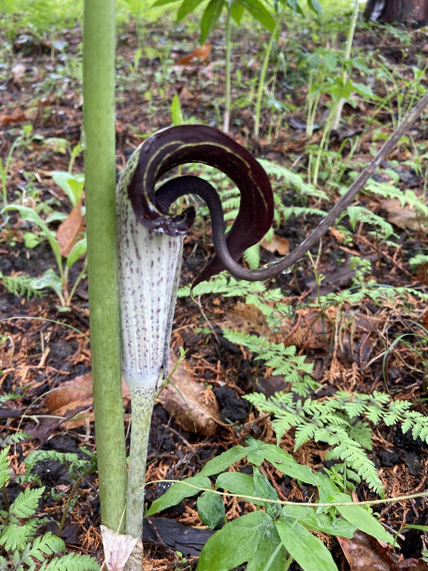 暗い木陰に生えているむらさき色の花は、同じテンナンショウ属のマムシグサのようにヘビが頭を上げている様子とよく似ていて、可愛らしい花ではなくグロテスクな花に見えます。