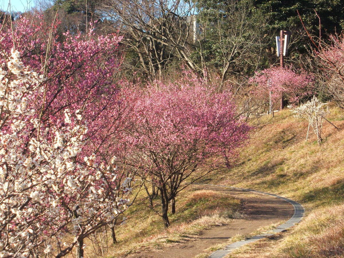 早春に咲く梅の花は、春の訪れを教えてくれます。シンプルな5枚の花びらを持つ花は、文様などでもよく使われています。花を観賞するだけでなく、果実は梅酒や梅干などに利用されますが、本園の梅林は、観賞用のウメがほとんどです。