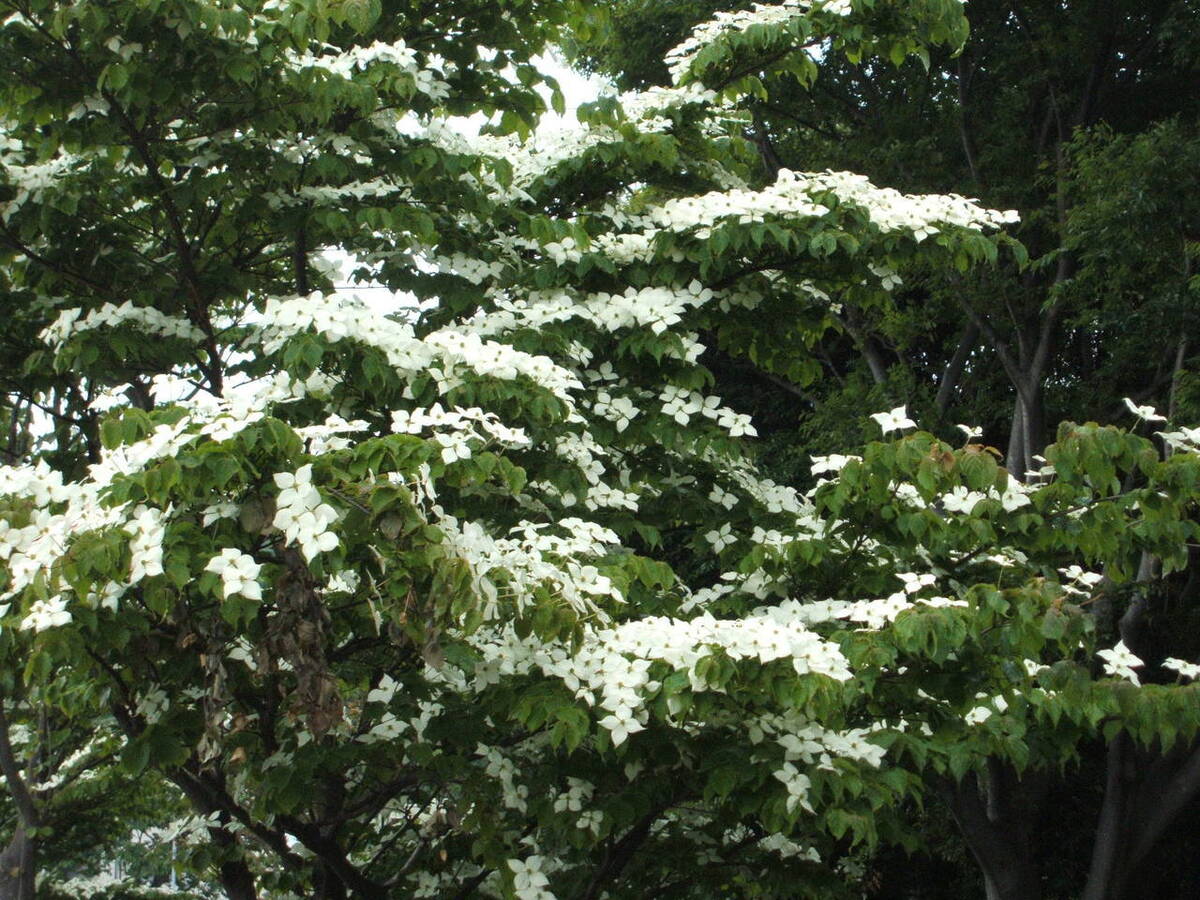 梅雨に入る少し前から、まっ白い花を咲かせます。花のように見えるのは総包片といわれる葉の一部です。秋には赤いイチゴのような甘い果実をつけます。