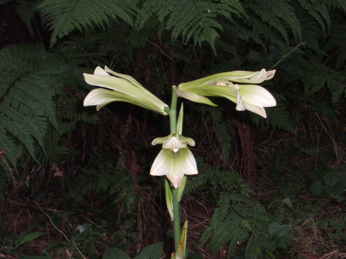 花の頃、葉が枯れていることが多いので「歯(葉)が無い」の語呂合わせにより『姥百合』。梅雨の最中に咲く大型のユリです。色が緑白色のため、目立たず、地味な花です。