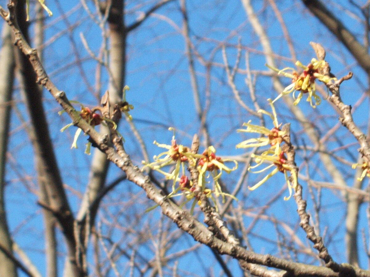 早春の葉が出る前に花が咲くので林のなかでよく目立ちます。花は黄色いひもがからまったような不思議な形をしています。