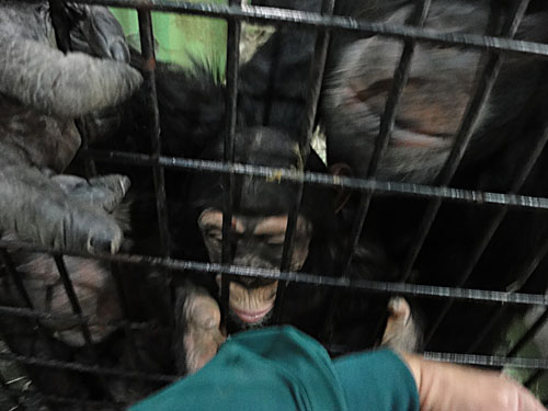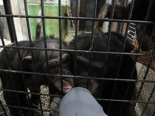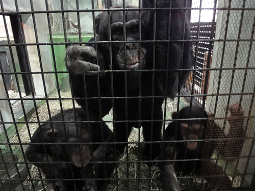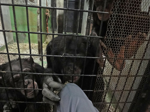 好奇心旺盛なチンパンジーたちの反応は?と思いつつチンパンジー舎に入ると…