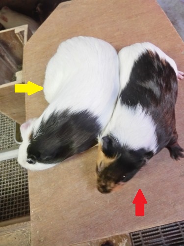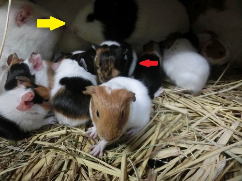 赤い矢印の先にいる子ですね!黄色い矢印のモルモットがお母さんです!