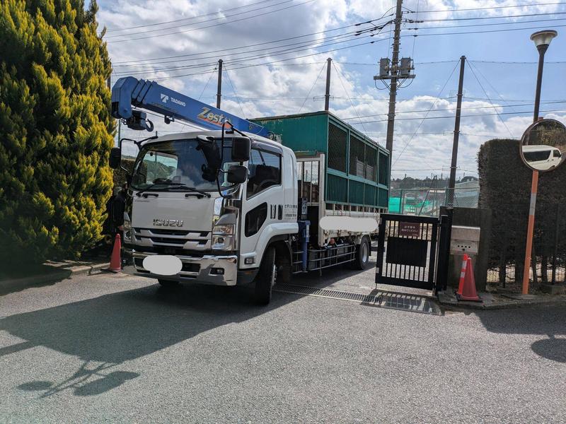 あっさりと輸送箱に入ってくれたサンペイですが、クレーン車に吊るされ、トラックの荷台に収まってもドンドン輸送箱を叩く力を緩めません。逆に元気で安心しました。