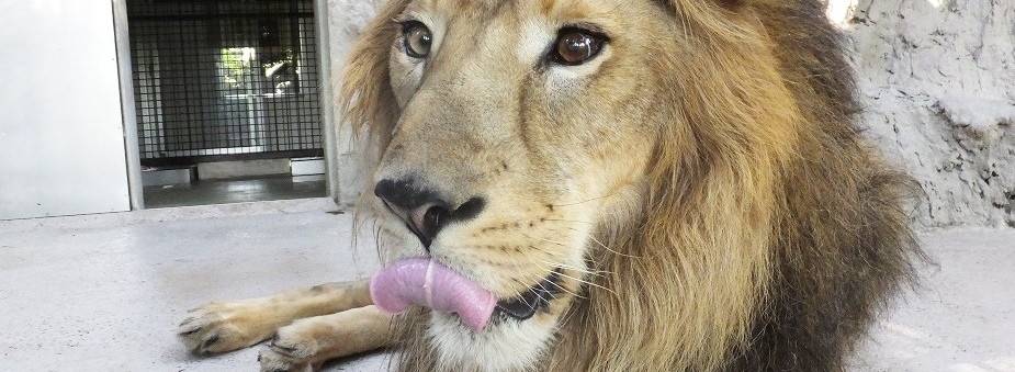 久しぶりにインドライオンのラージャーに丸鶏を与えてみました。