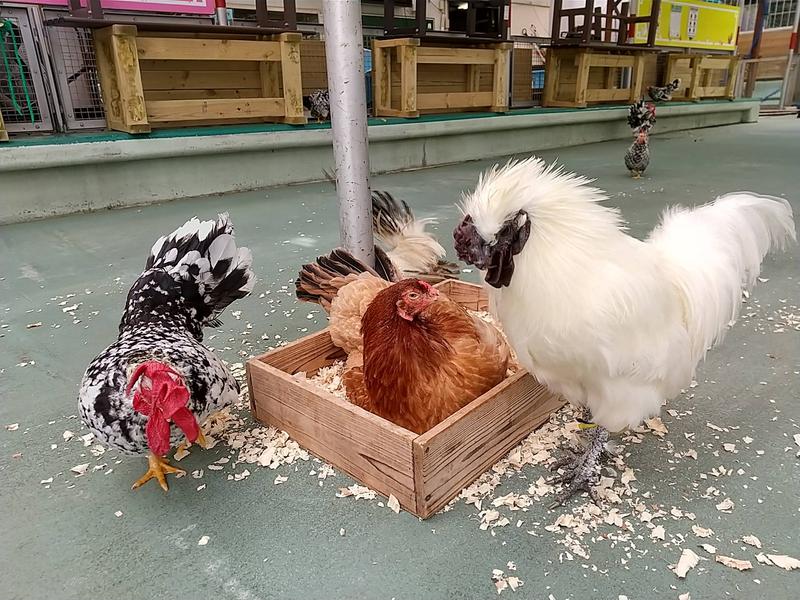 ニワトリたちは、機械のある所にはあまり興味を示さず・・・。