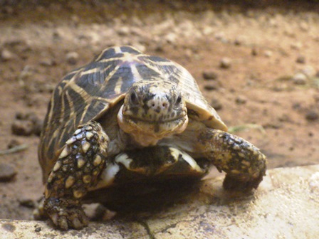 今年入園したインドホシガメの若いオスがとても人懐っこい性格をしています。リクガメたちは人が餌をくれる存在であることを覚えている個体が多いので、中に入ると皆寄ってくるのですが、この個体は寄ってくるという域を超えています。展示場に入るとこのように一生懸命にじり寄ってきて・・・。