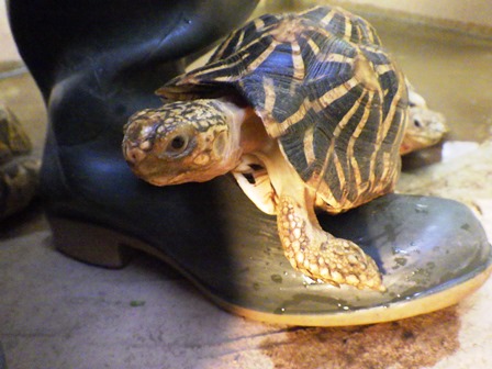 しまいには長靴の上で落ち着いてじっとしています。今までこんなに人懐っこいカメは初めてです。作業中踏みそうになってしまうので気を付けながらインドホシガメの世話をする毎日です。