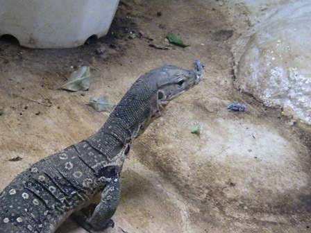 春先に入園したミズオオトカゲの子トカゲも元気です。普段は展示場内のベンジャミンの木に登っていますが、餌を与えるとするすると降りてきて追っかけまわしています。