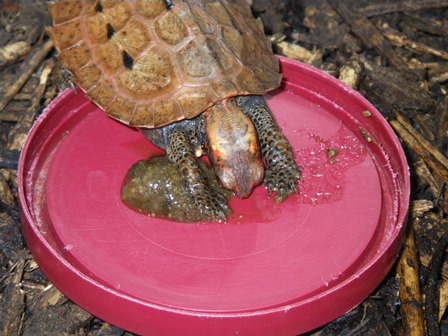 リュウキュウヤマガメの子ガメも元気です。私手作りのペーストもしっかり食べてくれるようになりました。柔らかく動かない餌なのに、やっぱり前足で抑えるような行動をとるのが妙におかしいです。