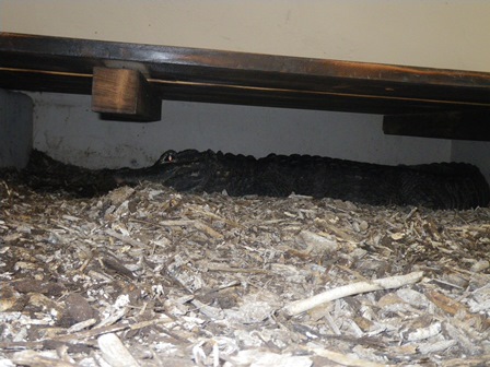 隠れる場所を作ってやればいいかなと思い、産卵場のふたを半分取り去ってみました。ヨウスコウワニが野生で暮らしている横穴のようになります。すぐにオスが入ってしまいましたが、それはそれでオスの姿が見えないのでメスは自由に陸場とプールを行ったり来たりできています。