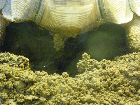 そんなわけでまったく産卵を予測してはいなかったのですが、引っ越してきてからしばらくして、メスが餌を残すことが1~2週間ほど続きました。週に2回しか餌を与えていないので、普段でしたら完食するのにどうしたのかなと思っていたのですが、卵かもしれないからレントゲンでも撮ってもらおうかなと思っていたら、ある日後ろ足でコンクリートの床を掘る行動が見られました。これはまずいと土の床である展示場に移したところ、次の日に穴掘りを始めました。