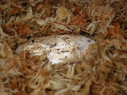 リュウキュウヤマガメの展示場には発酵チップが敷いてあります。程よく水分もミストでかけているので、時々白いキノコが生えています。8月末のある朝、「妙に大きなキノコが生えているな・・・。ん?」と思って展示場に入って確認したら、2個の卵でした。あまり掘らず、あまり埋めずで卵の表面が表に出ていたんですね。