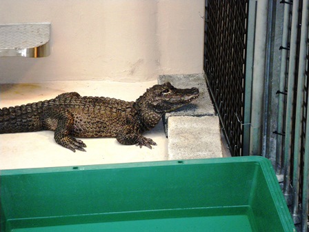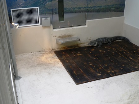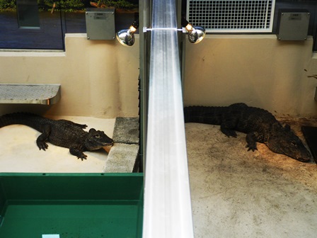 さて、話は変わりますがリニューアルした爬虫類館ではヨウスコウワニのお見合いを行っています。大阪の天王寺動物園さんからオスのヨウスコウワニをお借りできたので、野毛山に元からいたメスとペアリングさせようとしているんです。メスは最初からオスに興味津々で、熱い視線を向けているのですが・・・。