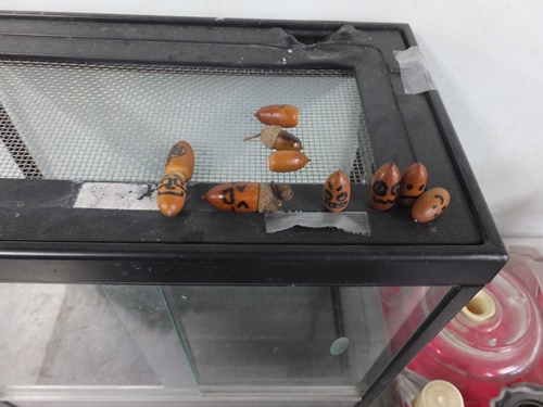 そして、なかには顔が書かれたどんぐりも混ざっています。さすがにインクが使われているので、動物に与えられませんので、夜な夜な園内の各所にこっそりと埋めて発芽を期待しています。ちなみに園内のどこに埋めたのか自分でも覚えていません。