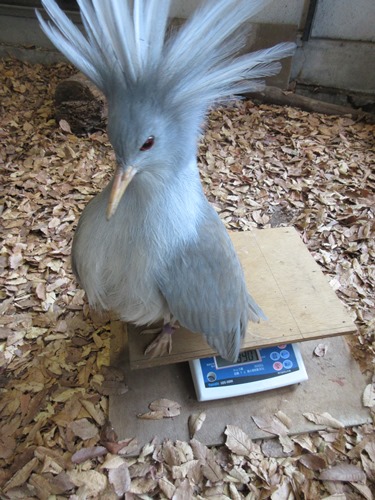もともと、人工育雛で育った「マロ」。誘導すると、はかりの上に乗ってくれました。