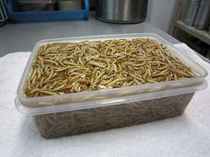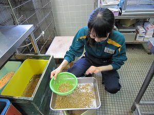 さてツバメの餌は何かというと、虫です。野毛山ではミルワームという虫を使用しています。この虫、ある程度育てて大きくしてから使うのですが、それにはこのようにふるいにかける必要があり、大量に必要になるのでそれがまた一苦労。
