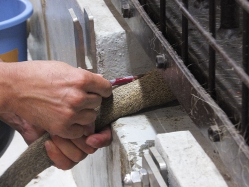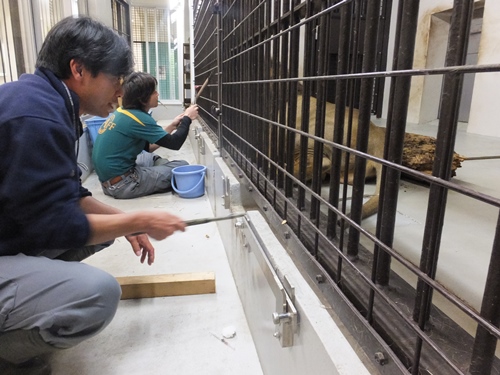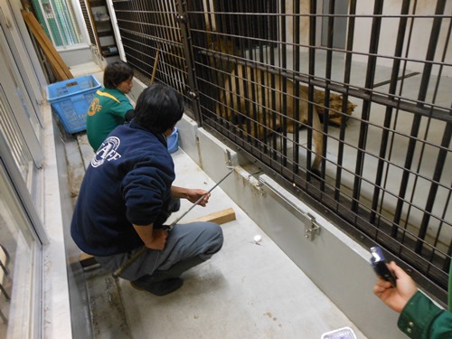 ラージャーの尾をフックを使い檻の外へだし、