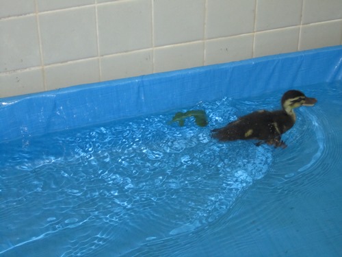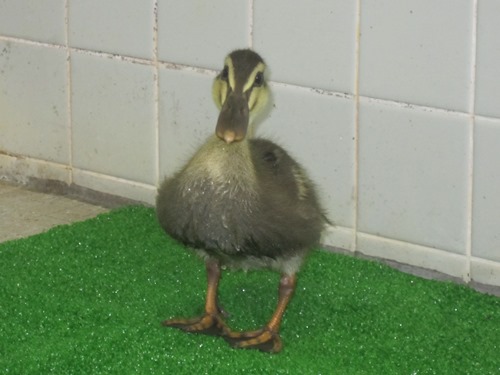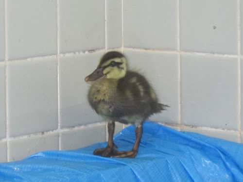このカルガモのヒナは、交通量が多い道路上で保護されてやってきました。保護された方の目前で、兄弟のヒナがトラックにひかれて死んでしまったそうです。親鳥が頭上を飛んでいたそうなので、このような場合、可能であれば、近くのなるべく安全と思われる場所に移動させて、ヒナから離れてあげると、再び親鳥とともに暮らしていけるのではないかと思います。