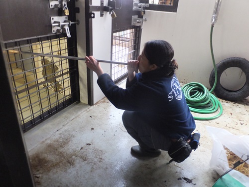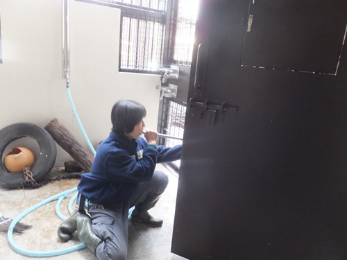 吹き矢を一発で決められるかは獣医の腕(口)にかかっています。一発で決められないと、獣医の「あっ!」とした表情と飼育係の「えっ?」とした表情の後に獣舎内に戦慄が走ります(笑)。