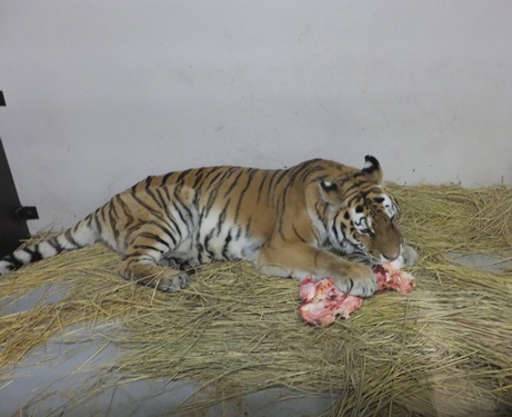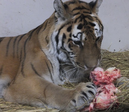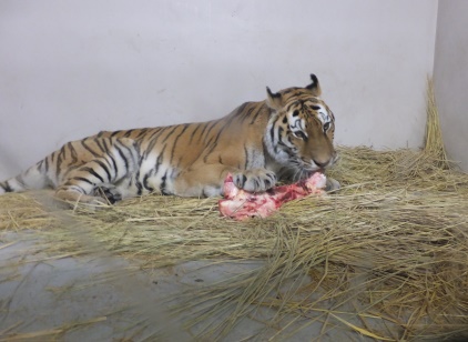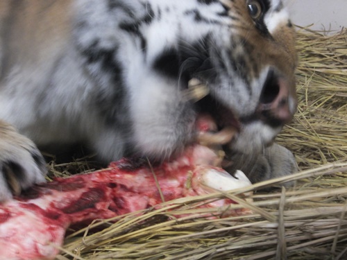 隣室のライオンのように若い個体なら力づくで食べることも可能かと思いますが、メイメイのように年老いた個体(今年で18歳)だと顎の力も弱く、また歯もだいぶすり減ってしまっているので、少しずつ着実に食べられる方法をとるようです。