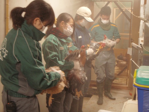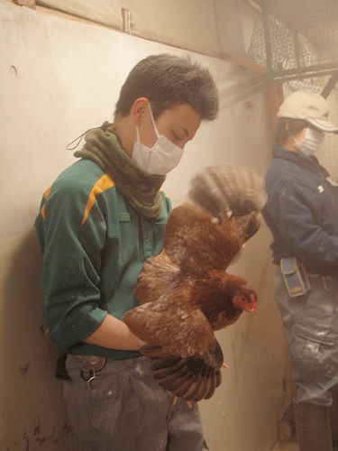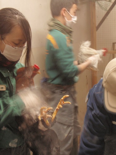 総勢46羽のニワトリたちに黙々と粉をまぶし続ける職員たち。