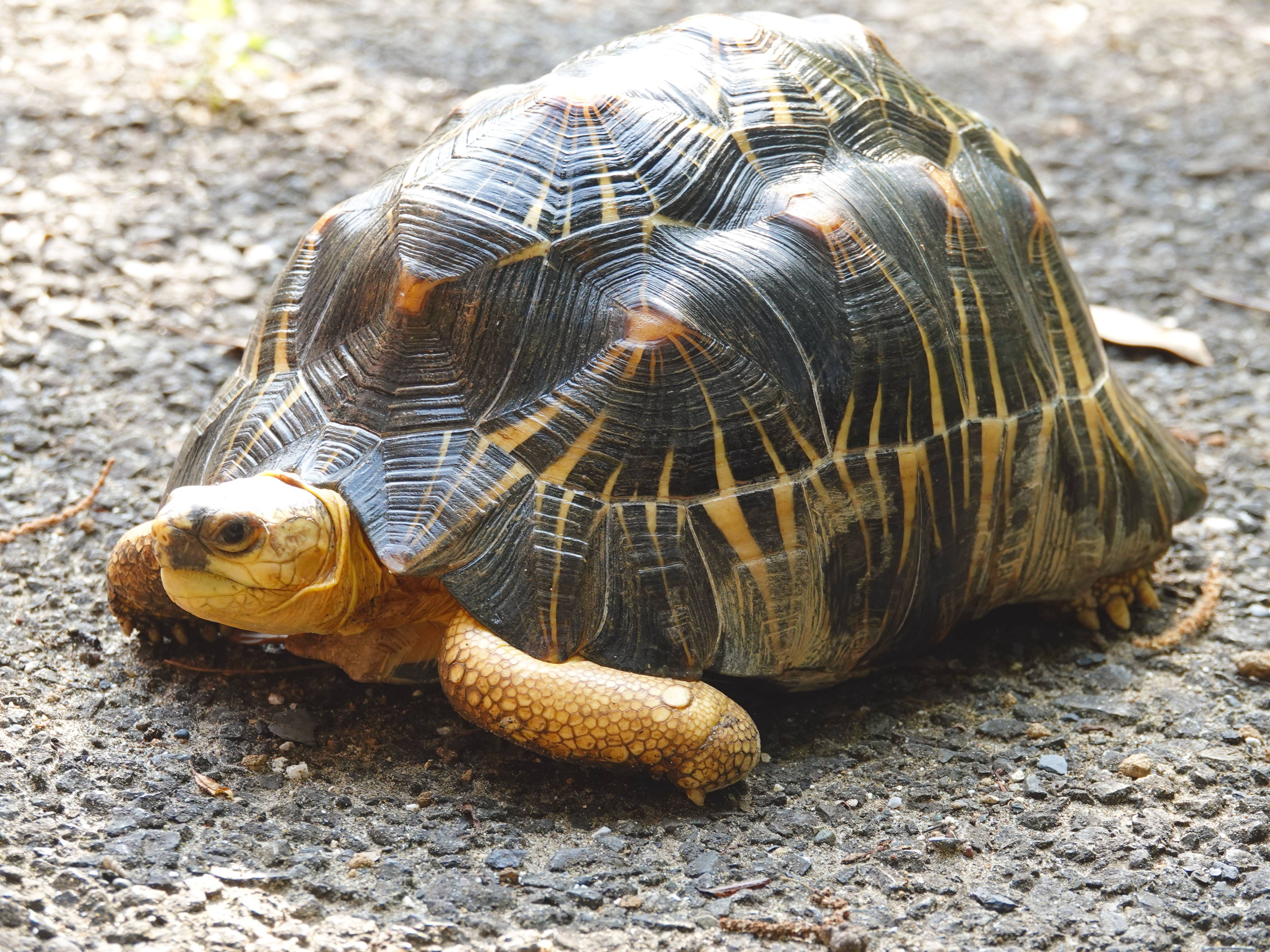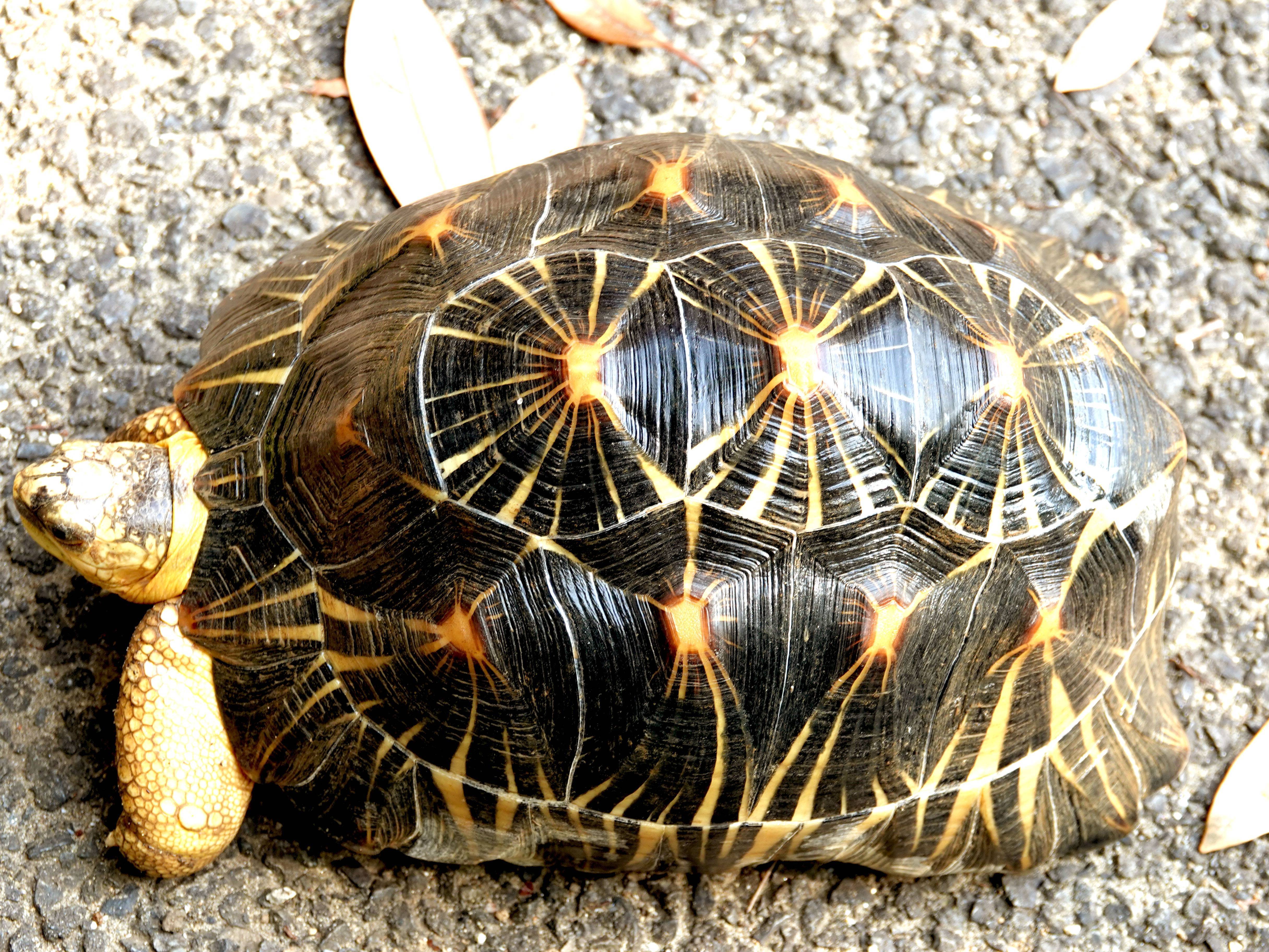 甲羅に放射状の黄色い模様があることが名前の由来。特徴的な模様が、高く盛り上がったドーム状の甲羅に入っていることから「世界でもっとも美しいカメ」と言われることもある。また、マダガスカル島で独自の進化を遂げたリクガメの一種であることから、別名「マダガスカルホシガメ」とも呼ばれる。甲羅の模様は個体ごとに違う。オスよりもメスの方が体が大きく成長する傾向がある。マダガスカル島では密輸や乱獲、自然破壊などの理由で数が減少しているが、人為的にモーリシャス島やユニオン島に持ち込まれ、繁殖し生息している。