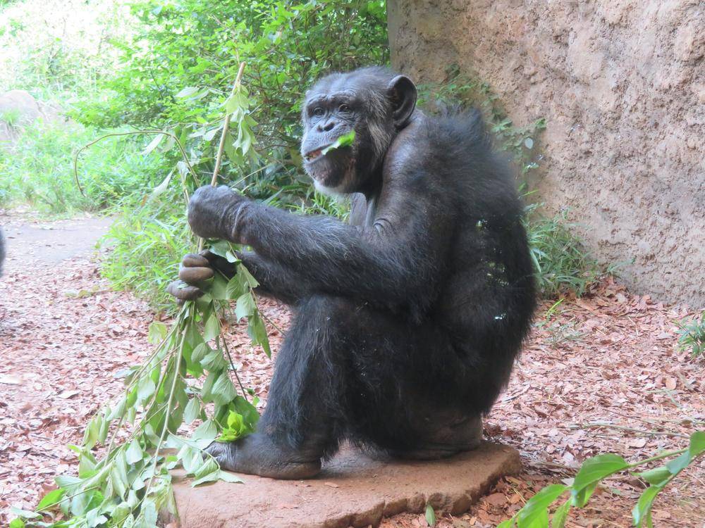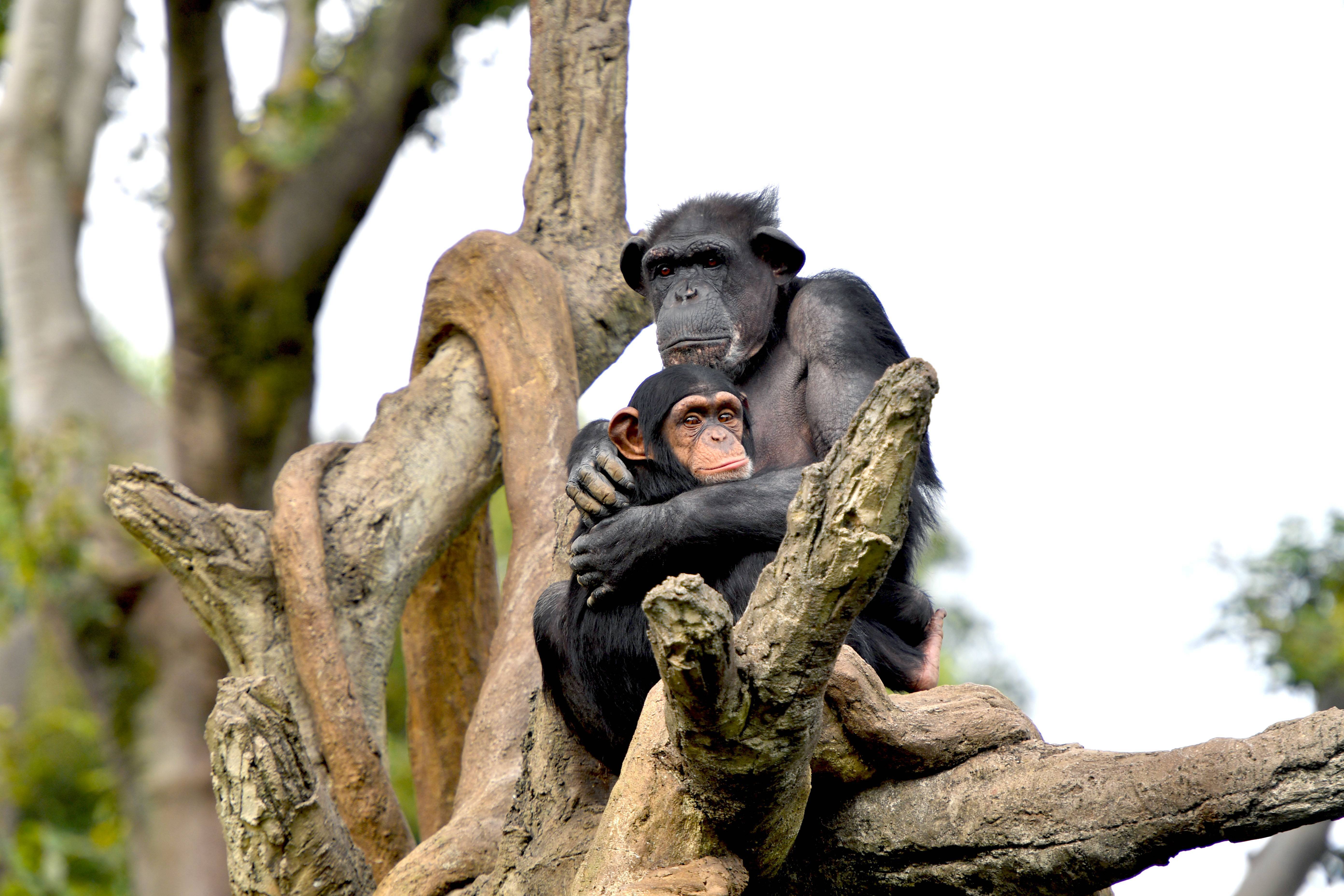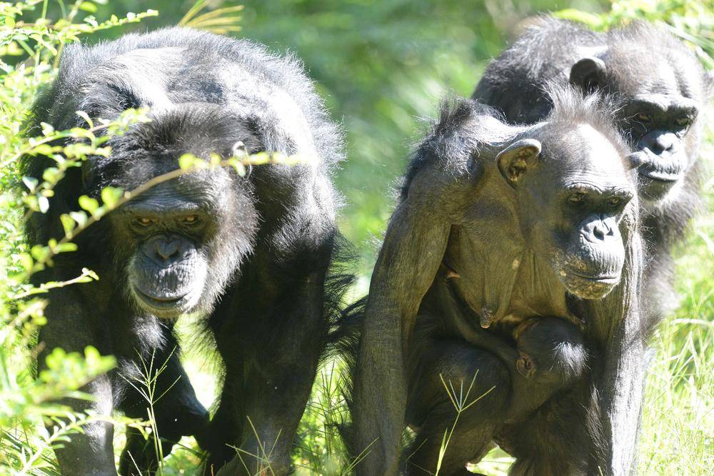 チンパンジーの群れは、複数のオスと複数のメス、子どもを含む数10頭で構成されている。その集団は1~数頭の小集団が合流したり分裂したりする離合集散をくり返し、時には大きな集団になることがある。集団構成の規則制はなく、いつも一緒に行動するのは母親と子どもだけ。メスは9~11歳になると生まれた群れを出て、別の群れに移籍するが、オスはおとなになっても生まれた群れにとどまり、父系社会を形成する。
