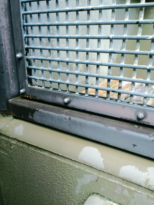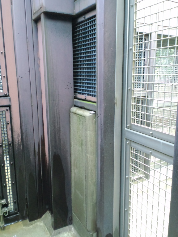 この写真のまんなかくらいの檻とコンクリートの壁のすきまです。