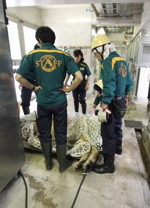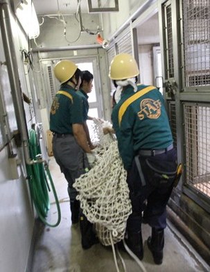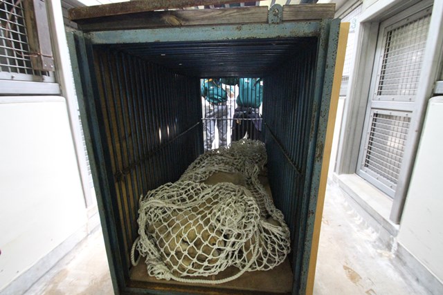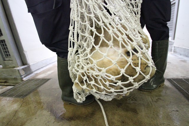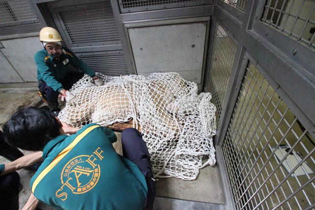 寝室に収容し、包んでいた捕獲網からナーラさんを出し、麻酔を覚ます薬を打ちます。