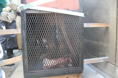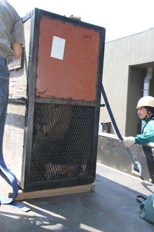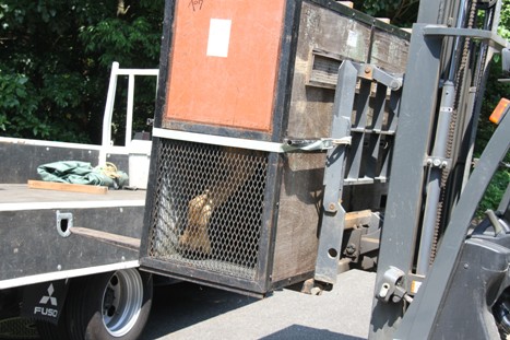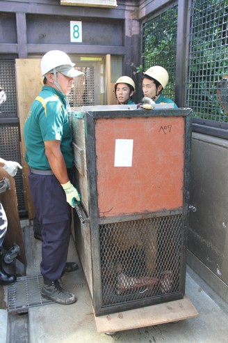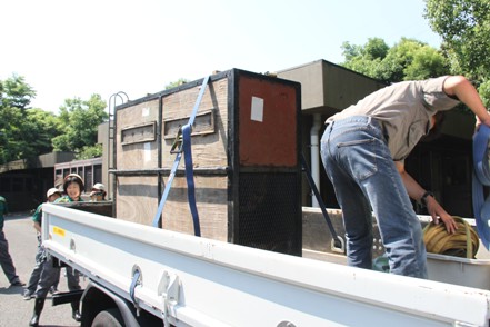 ライオン舎からやっとラージャーの入った輸送箱を出すことができました。
