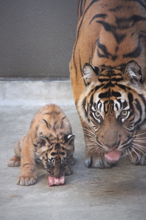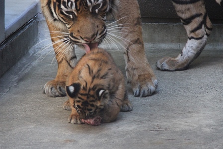 子トラを応援するかのように、母親のデルが舐めに来ました!