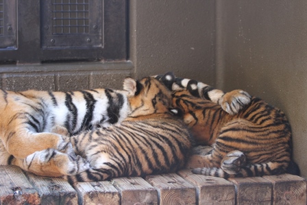 サブ運動場の様子ですが、1頭は寝台上にいて、もう1頭は下にいますね。