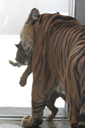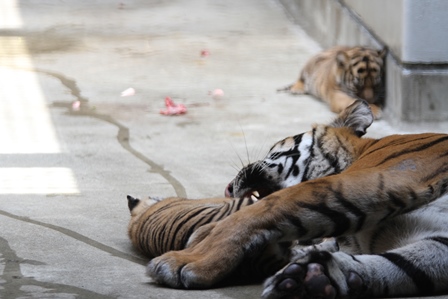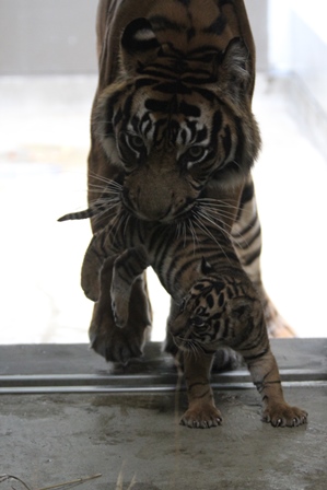 最終的には舐めても動かないように 、お母さんが前足で子どもをおさえてしまいました!