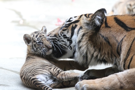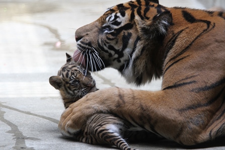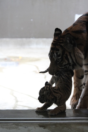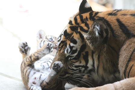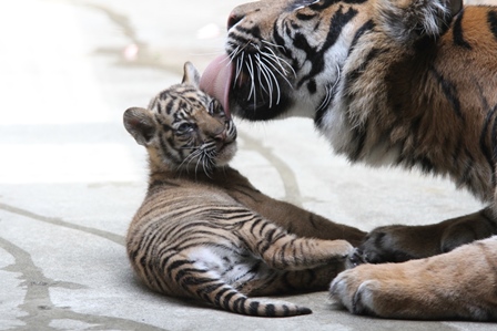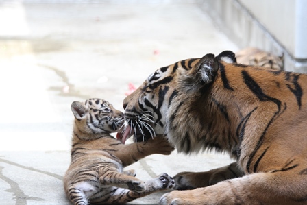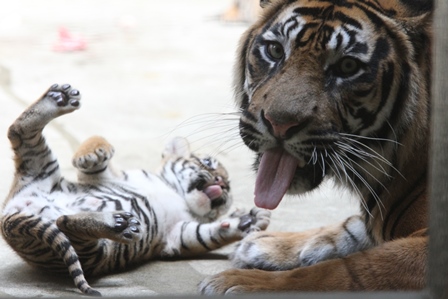 子どもは遊びたく、お母さんは舐めてあげたいようですね!