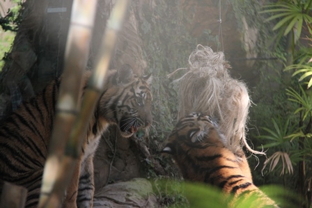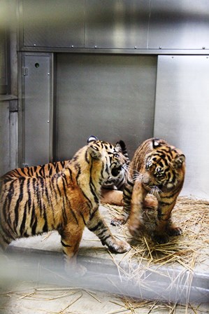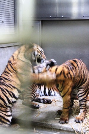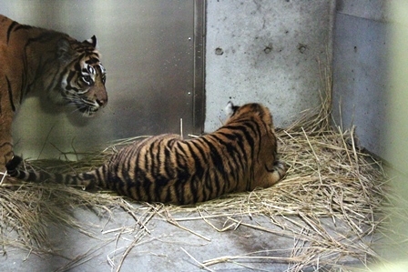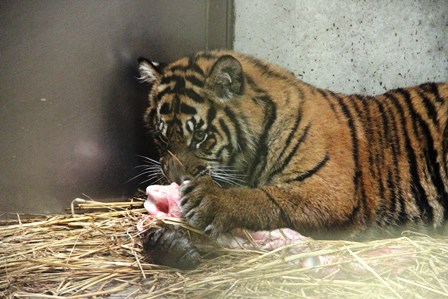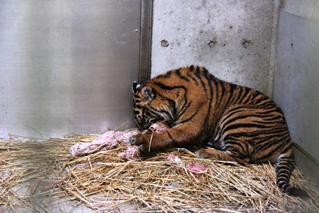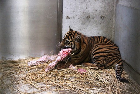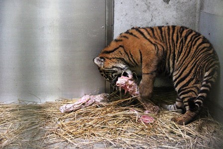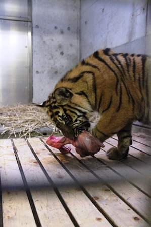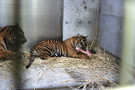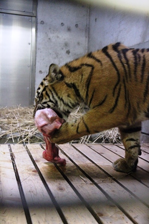 先月からトラの母子には、曜日固定の日替わりメニューでエサを与えています。