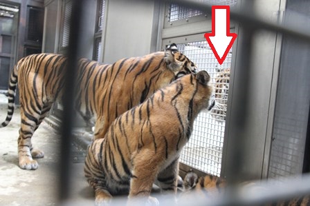 既にデルは横になってしまっていますが、子トラたちは金網の中を気にしていますね! ↑