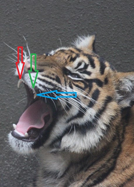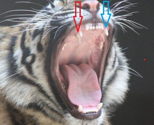 そして左側には、緑と青の矢印の先に、それぞれ犬歯が確認できるはずです!