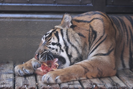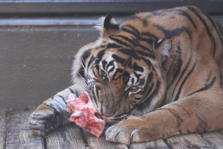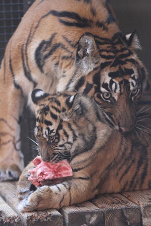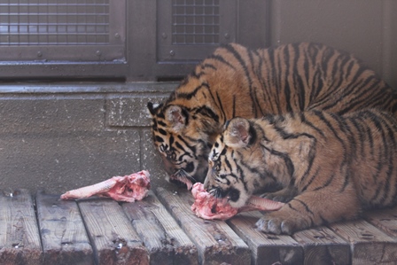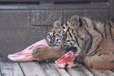 そうこうしているうちに、ダマイも自分の分を咥えて台上に飛び乗りました!