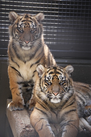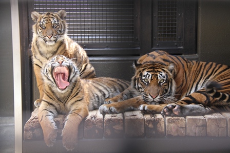 更新日:2015.04.12サブでの様子 更新日:2015.04.12 サブでの様子 前回は、春らしい睡眠中のトラたちを紹介しました。今回は、同じくサブでに様子ですが、ちょっと違う姿を・・・(=^・^=)以前もご紹介しましたが、サブ運動場で軽く餌を与えます。3頭とも行儀よく採食していますね(*^_^*)餌は少ないので、10分もしないで食べ終えます。その後は・・・3頭とも寝台に上がって休息タイムあ~~、眠い!ゴロン普段は、こんなに凛々しいのにな~(・_・;)飼育展示係石和田 研二 この記事をシェアする Facebook Twitter LINEで送る 春は眠い… 春、到来…