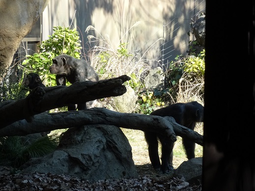 「ほらほら、コドモのチンパンジーが遊んでるよ」