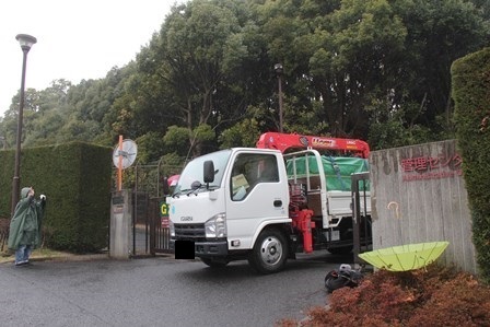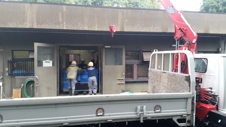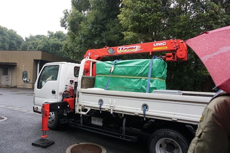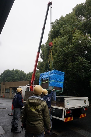 そして、クレーンで吊り上げられて、トラックの荷台の上に。