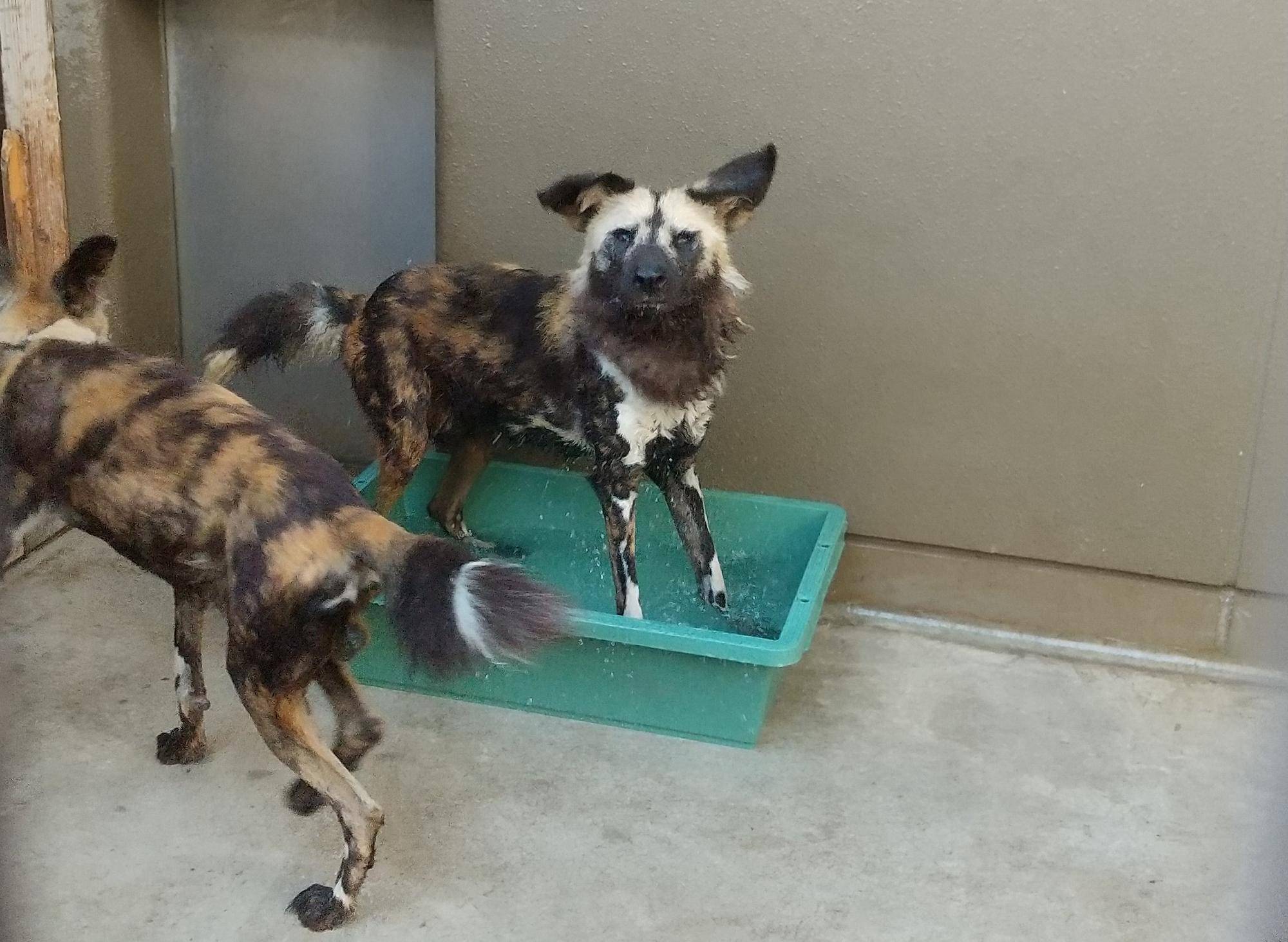 汗をかけないリカオンは水浴びをして気化熱で体温を下げます。