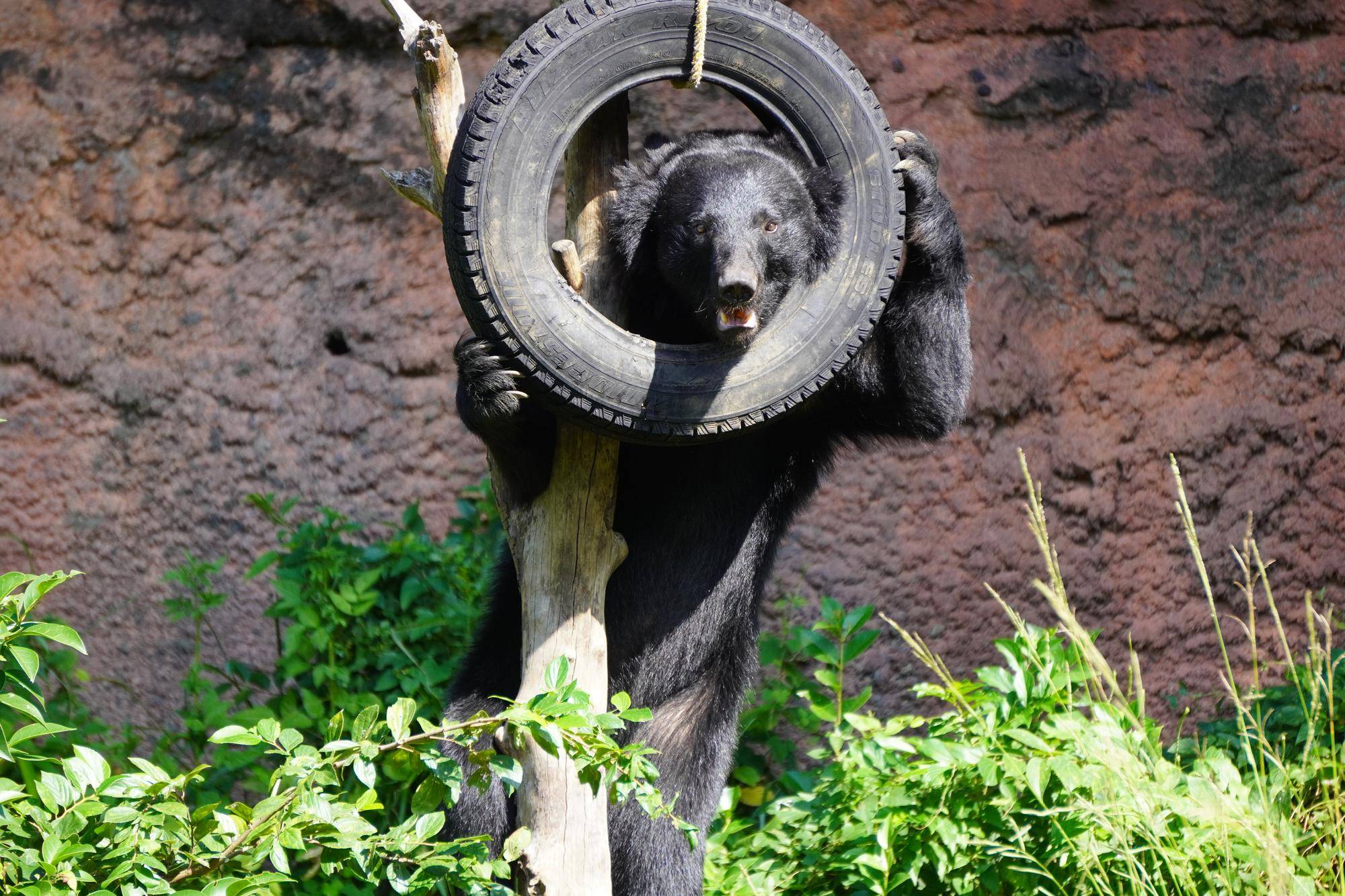 ツキノワグマ舎の倉庫に眠っていたタイヤを使ってみました!タイヤの中に小さく切った朝の餌を入れて、木に吊るします。