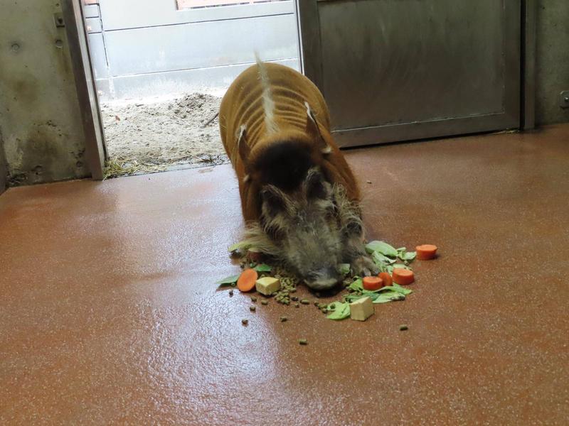 アカカワイノシシは非常には鼻が器用で、きりはニンジンをドアのレールによく挟んでいます。