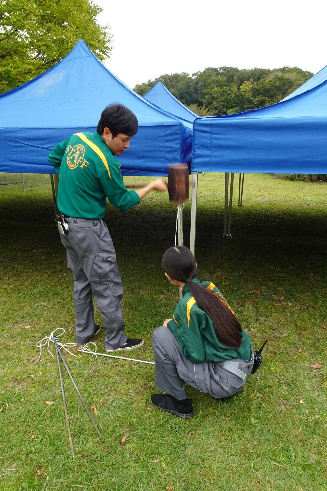 テントが風で飛ばされないように、周囲に杭を打って固定したり。