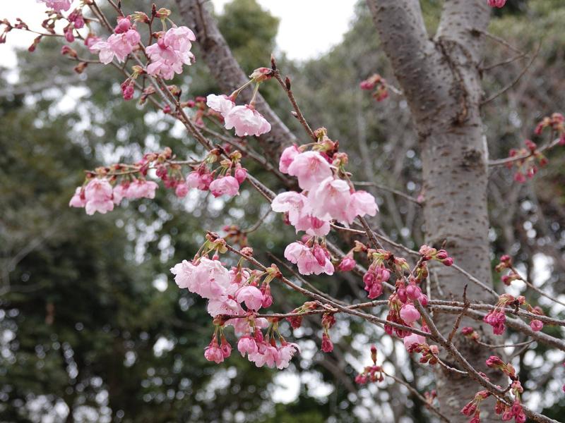まずは、園内バス「ゾウさんのりば」から見える、「カワヅザクラ」の様子。